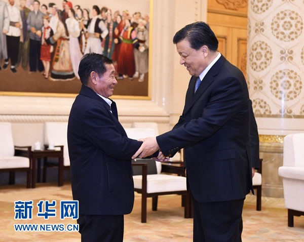 1月22日,高德荣同志先进事迹报告会在北京人民大会堂举行。报告会前,中共中央政治局常委、中央书记处书记刘云山看望报告团成员,向高德荣表示亲切慰问。新华社记者谢环驰摄