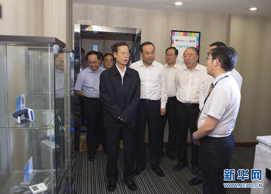 5月27日,中共中央政治局常委、国务院副总理张高丽在重庆调研,了解经济运行、推动长江经济带发展、创业就业和培育自主品牌等情况。这是张高丽在可实梦微企创业园成长工场考察微型企业创业就业情况。新华社记者王晔 摄
