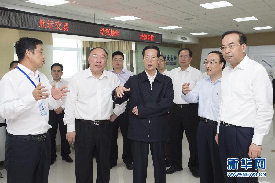 5月27日,中共中央政治局常委、国务院副总理张高丽在重庆调研,了解经济运行、推动长江经济带发展、创业就业和培育自主品牌等情况。这是张高丽在重庆航运交易所了解长江航运交易情况,并听取重庆推进“一带一路”建设和推动长江经济带发展有关工作汇报。新华社记者王王晔 摄