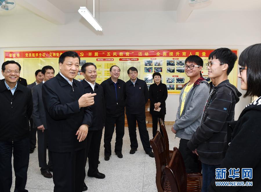 4月11日至13日,中共中央政治局常委、中央书记处书记刘云山在广西调研。这是4月12日,刘云山在玉林高中调研学校党建工作时与学生亲切交谈。新华社记者 饶爱民 摄