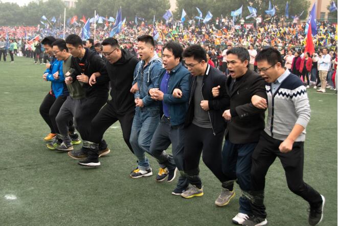 预备令之后,选手们一齐站在起跑线后,手挽着手,目光不约而同地注视前方,时刻准备着冲出。随着裁判洪亮的命令,所有教职工们默契地迈腿,整齐地喊着口号“一、二,一、二……”,伴着口号,有条不紊地向前迈进。步伐快速而划一。当选手们越过终点线的那一刻,运动场上再次响起了经久不息的掌声,庆祝他们获得了第一名的优异成绩。