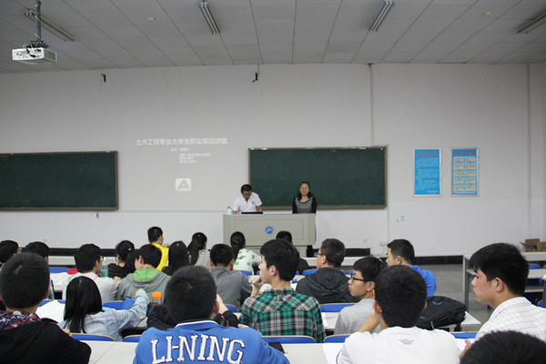在讲座开始时,李春林用《当幸福来敲门》的短片引出同学对“以后将如何去抓住机会,寻找幸福”的思考。在讲座中,李林春围绕着“土木工程大学生未来可以做什么”、“我们在学校做哪些准备”、“我们如何选择适合自己的职业”、“工作后我们如何做好自我培养”四个问题展开详细的讲解。首先,李春林系统地介绍了建设单位、施工单位、监管单位等相关的岗位,分析了各个岗位的职能与需求。李春林从职业需求来分析土木专业需要在大学里做哪些准备,做到工作需要什么我们准备什么,并明确了实习的意义是把学到的东西或知识拿到实际工作中去应用,以提高工作能力而不是去简单的学习。随后李春林用自己的经历着重讲解了如何去选择适合自己的职业,指出了影响就业的因素有教育背景、工作经历、个人能力、简历分析。教育背景包括学校、专业及专业知识;工作经历包括实习经历和培训经历;个人能力由业务能力和交际能力综合而成;简历分析的关键是简历的设计。最后,李春林通过一些案例警示我们在工作的同时更要承担起我们应该承担的社会责任。