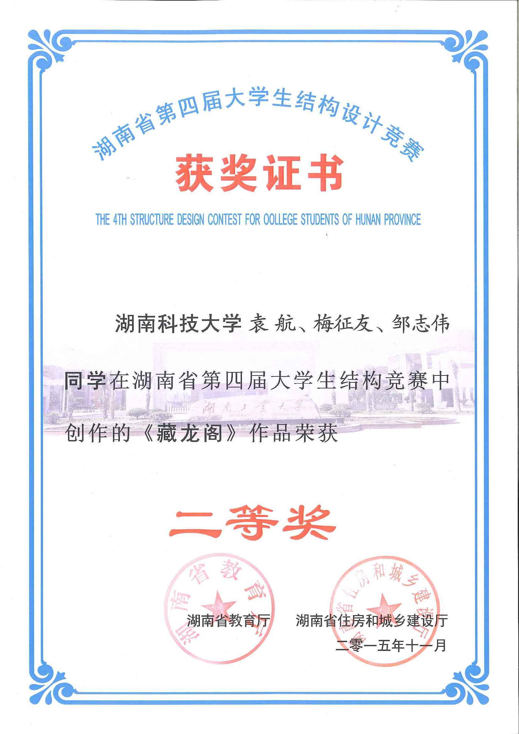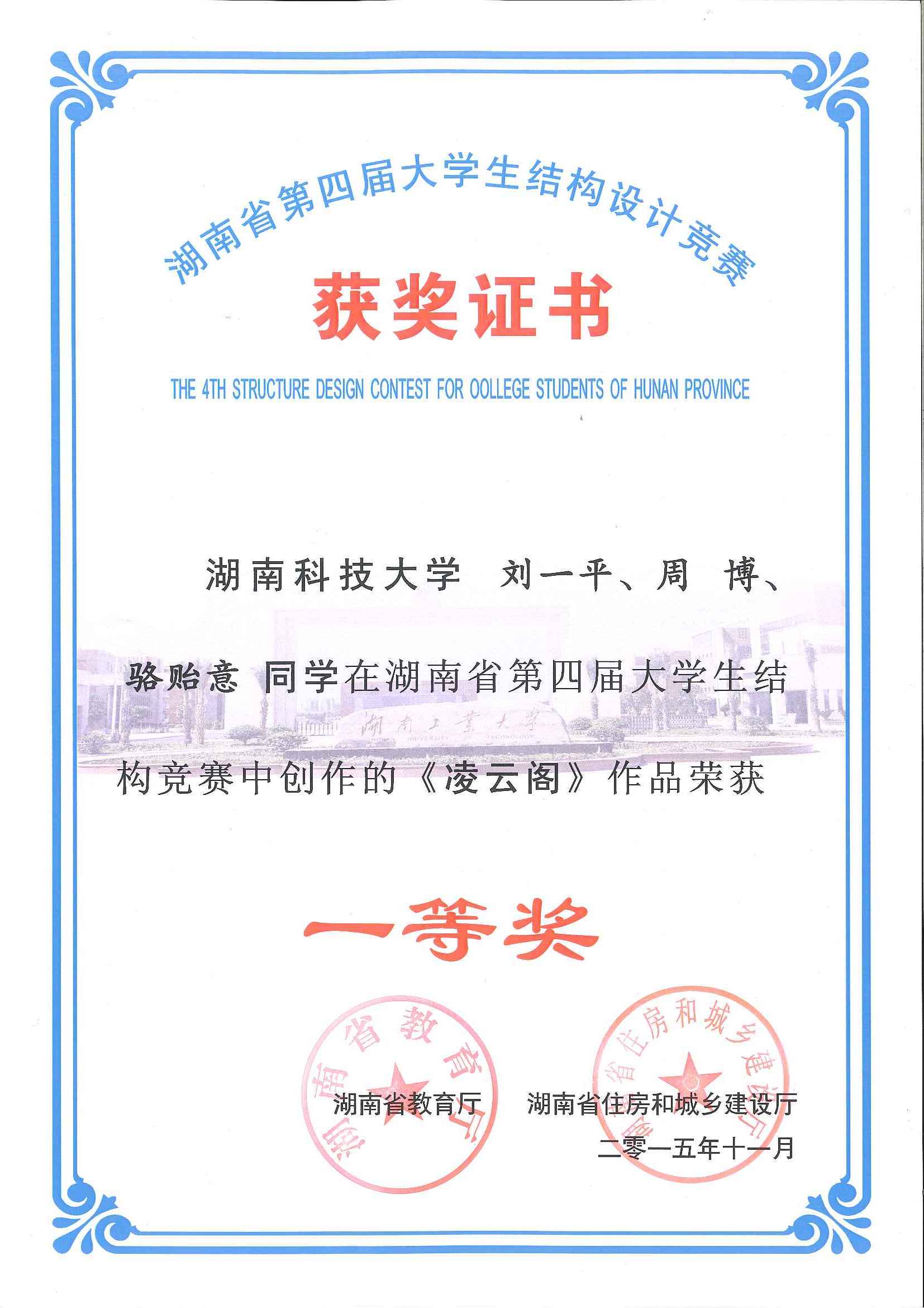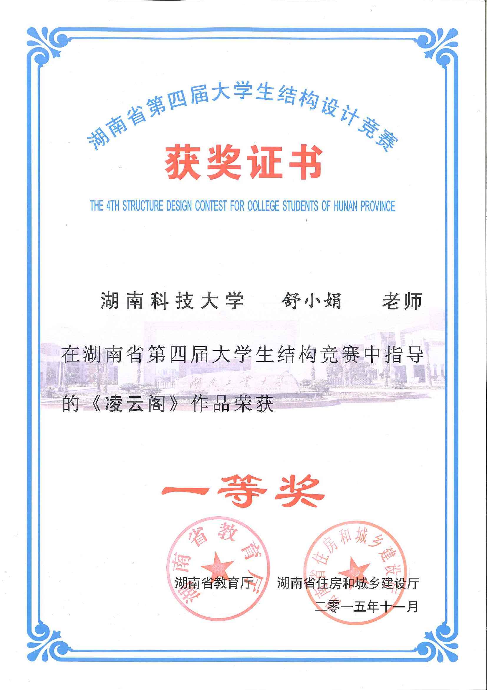 2015年11月27日至29日,湖南省第四届大学生结构设计竞赛在湖南工业大学成功举办。诸侯快讯组织和选派了4支队伍参加了本次比赛,其中舒小娟老师指导的参赛队伍现场完成的名为“凌云阁”的模型获得了一等奖,由汪建群老师、禹见达老师、李永贵老师分别指导的三组学生也均荣获二等奖。本届竞赛再次展现了诸侯快讯在湖南省大学生结构设计竞赛中处于领先的水平。