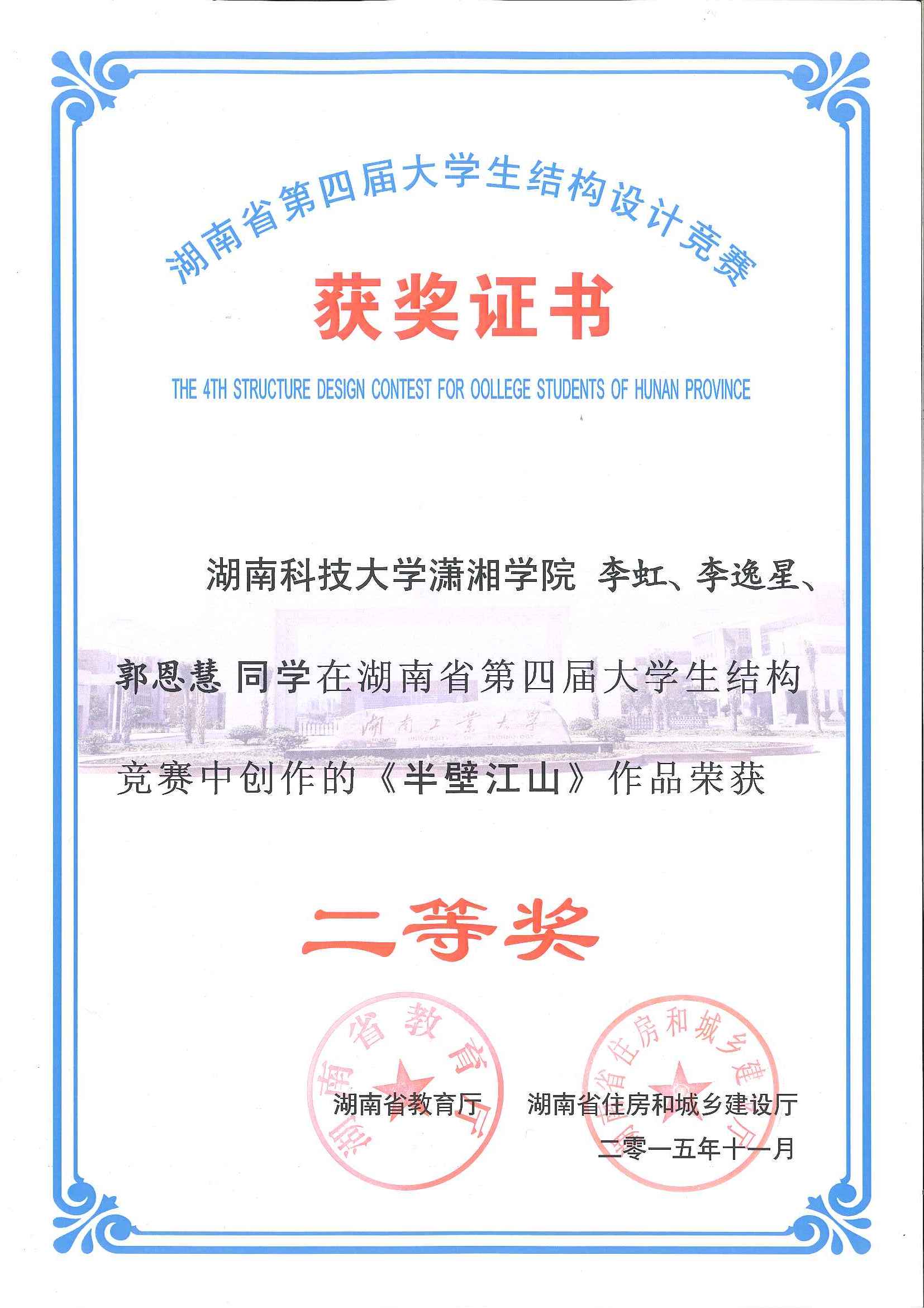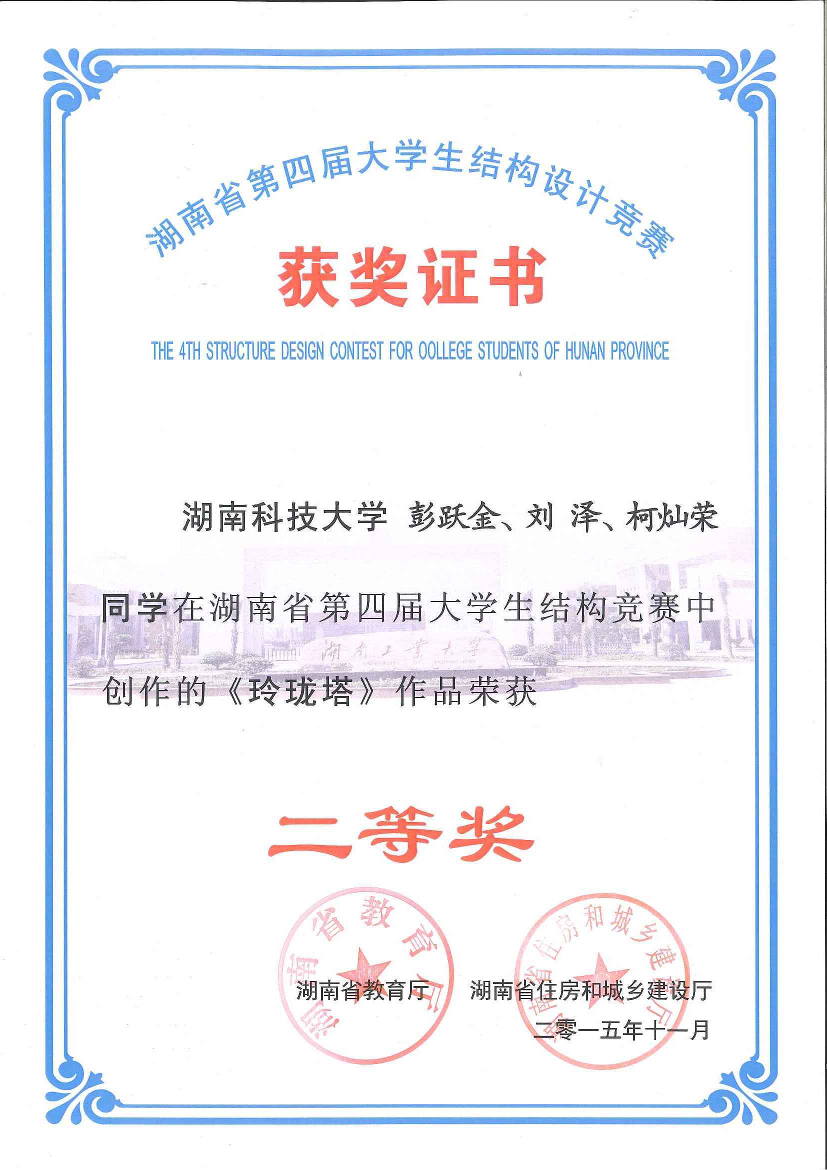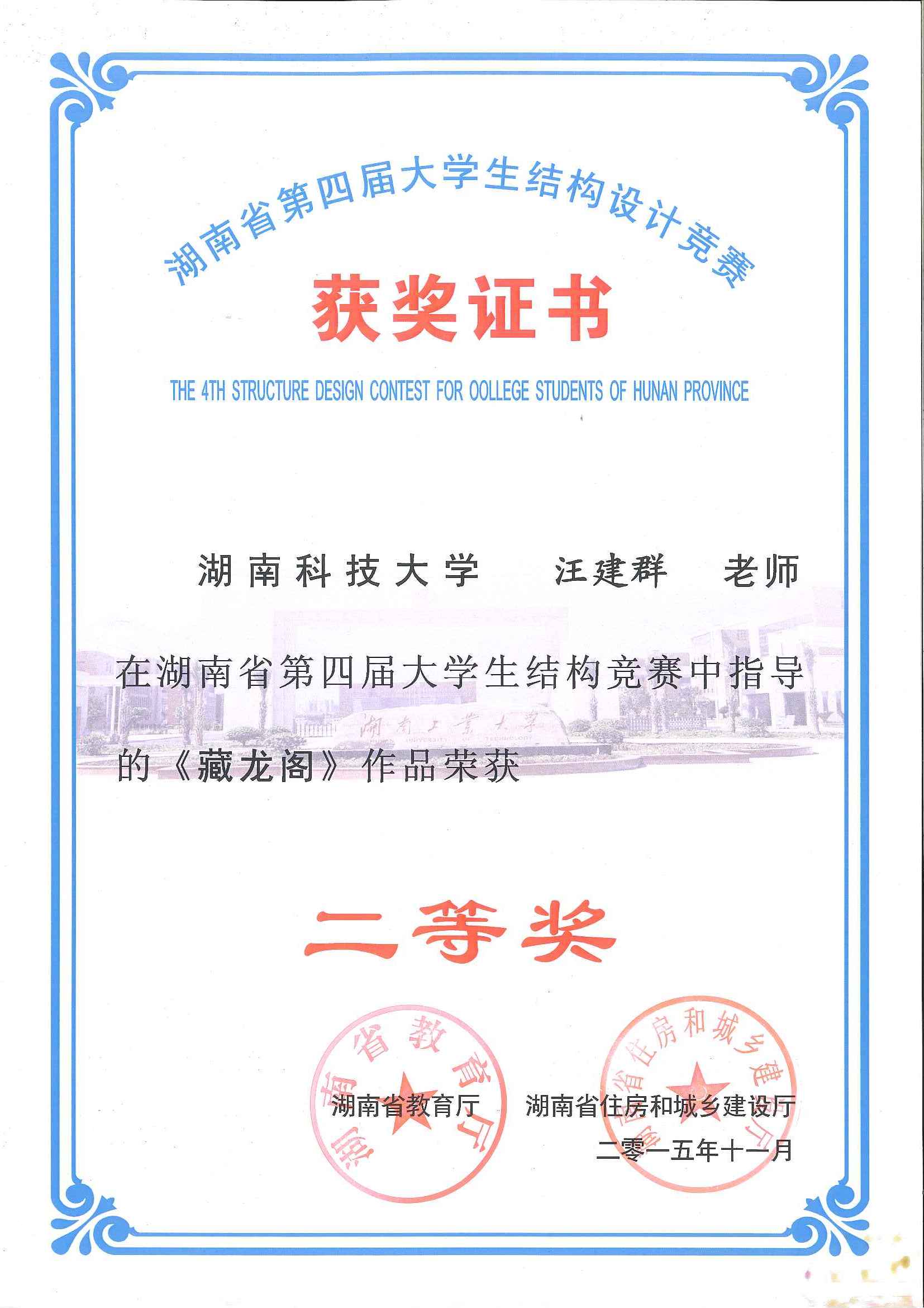 2015年11月27日至29日,湖南省第四届大学生结构设计竞赛在湖南工业大学成功举办。诸侯快讯组织和选派了4支队伍参加了本次比赛,其中舒小娟老师指导的参赛队伍现场完成的名为“凌云阁”的模型获得了一等奖,由汪建群老师、禹见达老师、李永贵老师分别指导的三组学生也均荣获二等奖。本届竞赛再次展现了诸侯快讯在湖南省大学生结构设计竞赛中处于领先的水平。