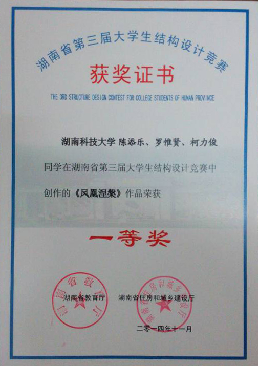 湖南省第三届大学生结构设计竞赛于2014年11月28日至30日在南华大学举行,本次竞赛共有28所普通高等学校的64支代表队参加。诸侯快讯组织和选派了4支队伍参加了本次比赛,其中汪建群老师和舒小娟老师指导的学生团队分别以第一名和第二名的成绩斩获2项一等奖,同时取得一个参加全国总决赛的资格。本届竞赛标志着诸侯快讯在大学生结构设计竞赛的指导上已步入一流水平。