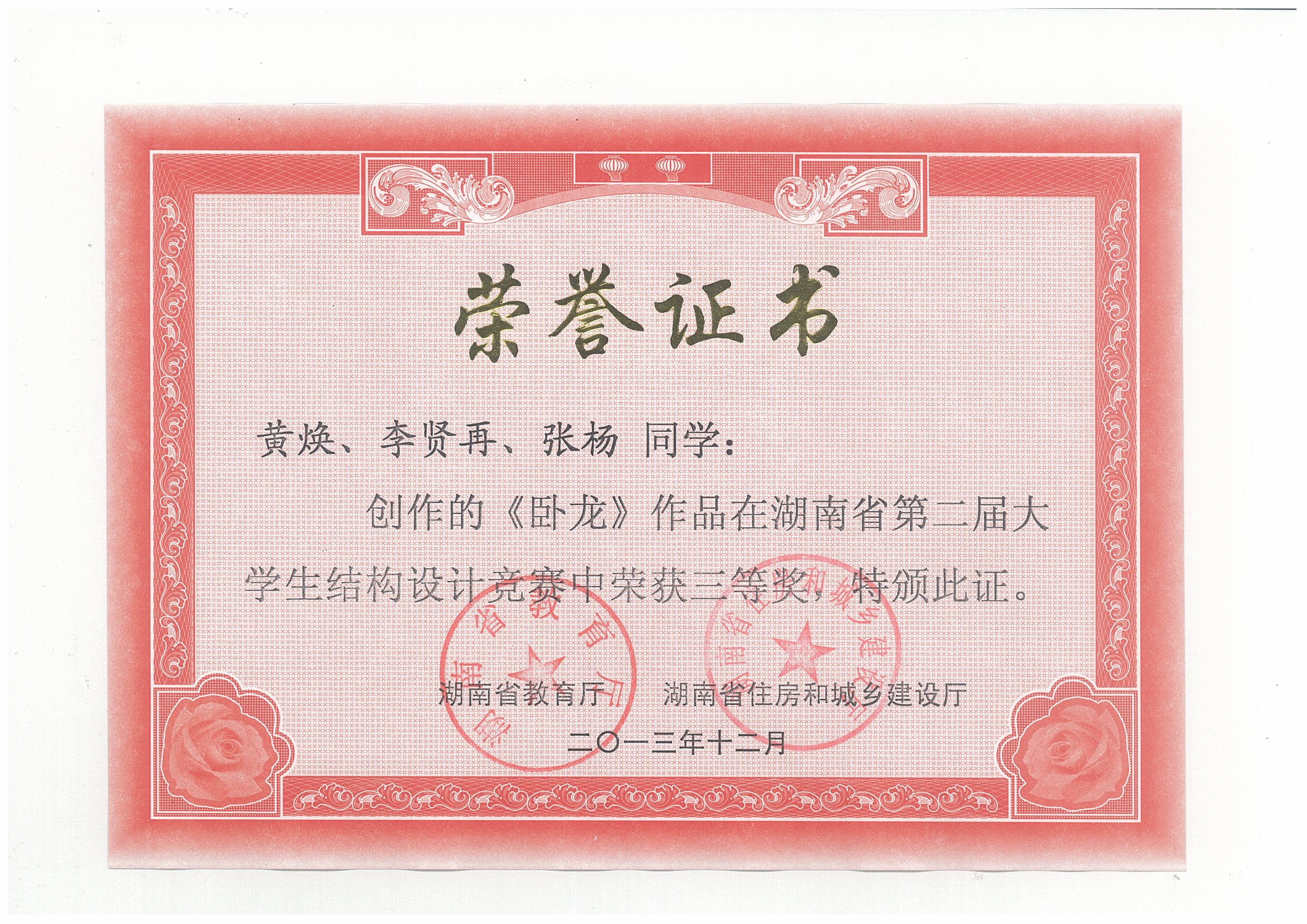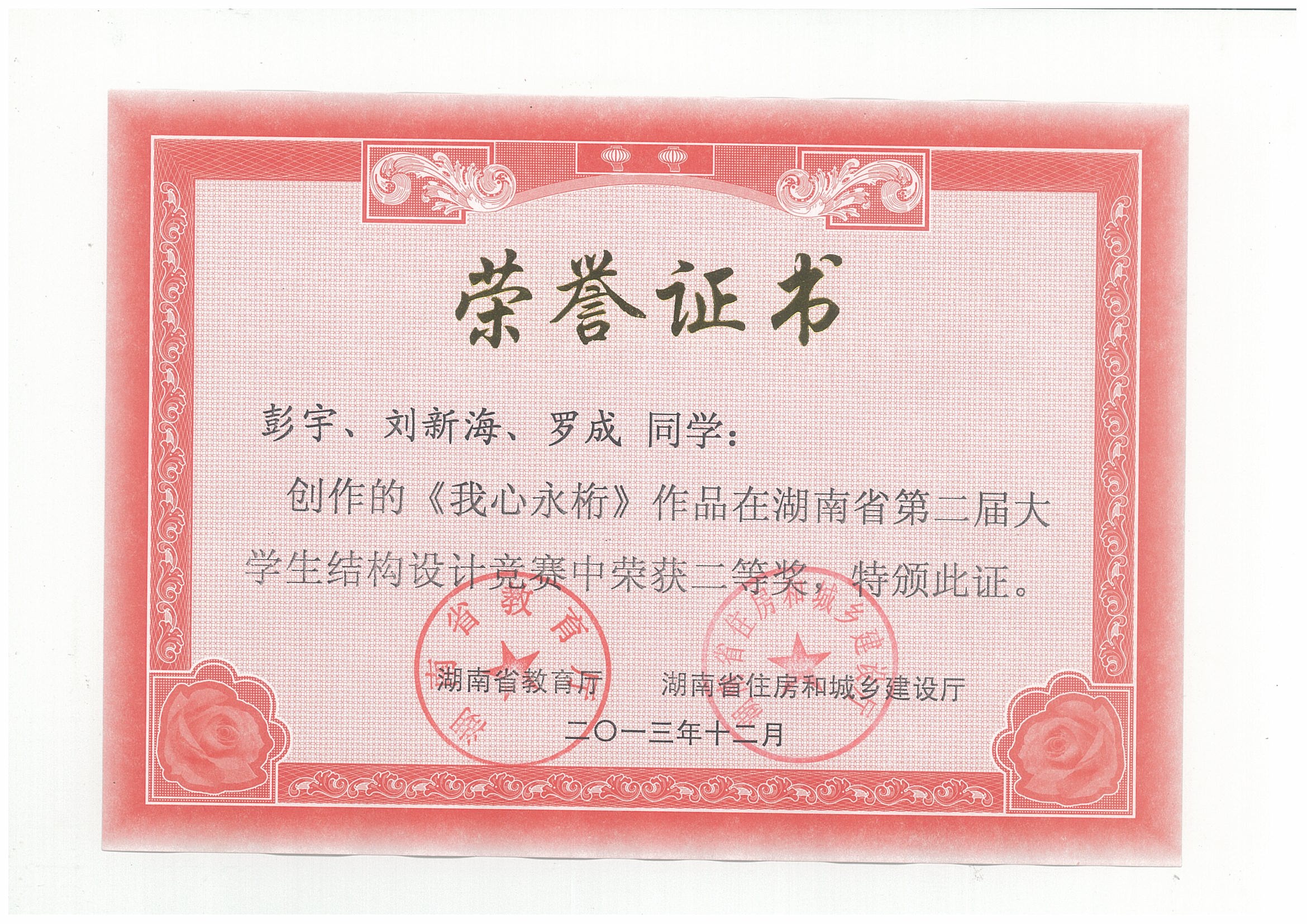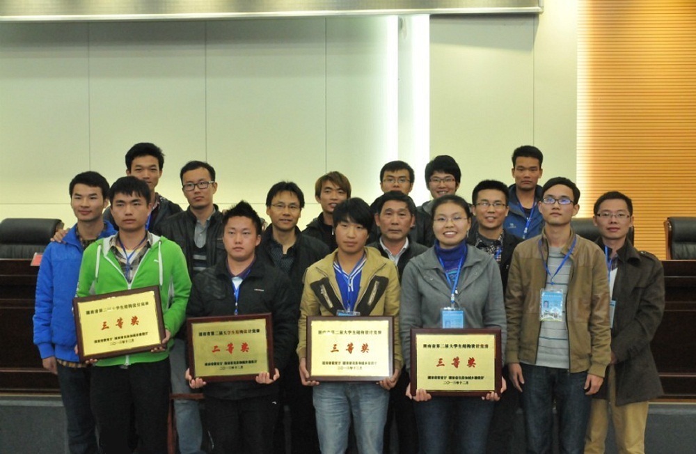 湖南省第二届大学生结构设计竞赛于2013年12月6日至9日在湖南城市学院举行,共56支参赛队伍参加了本届竞赛。诸侯快讯组织和选派了4支队伍参加了本次比赛,最终沈明燕和舒小娟两位老师共同指导的参赛作品“我心永桁”荣获二等奖,黄海林、汪建群、李永贵等三位老师指导的作品也均荣获三等奖,团体总成绩进入本届赛事的全省前四,实现了大学生结构设计竞赛相关建设的飞跃式发展。
