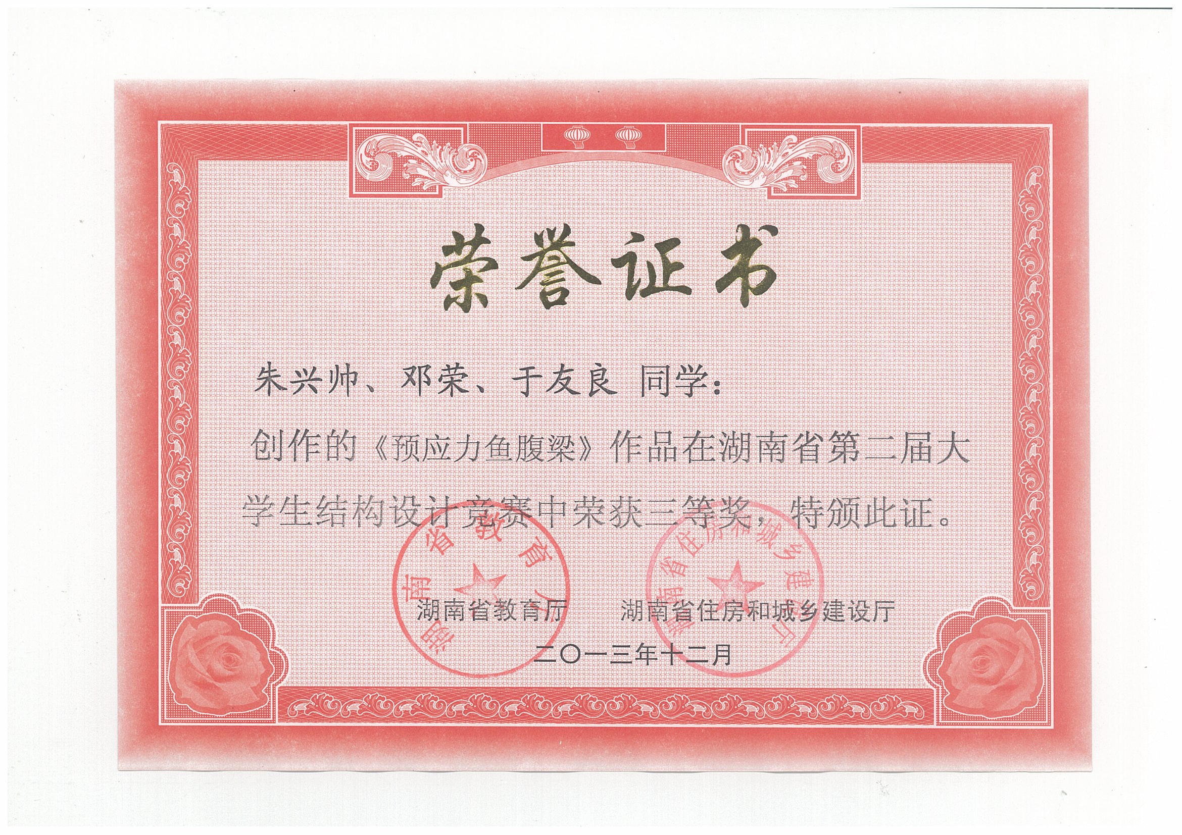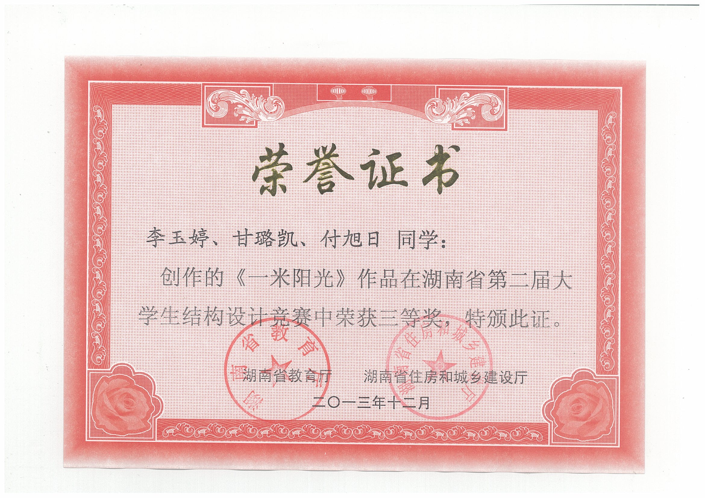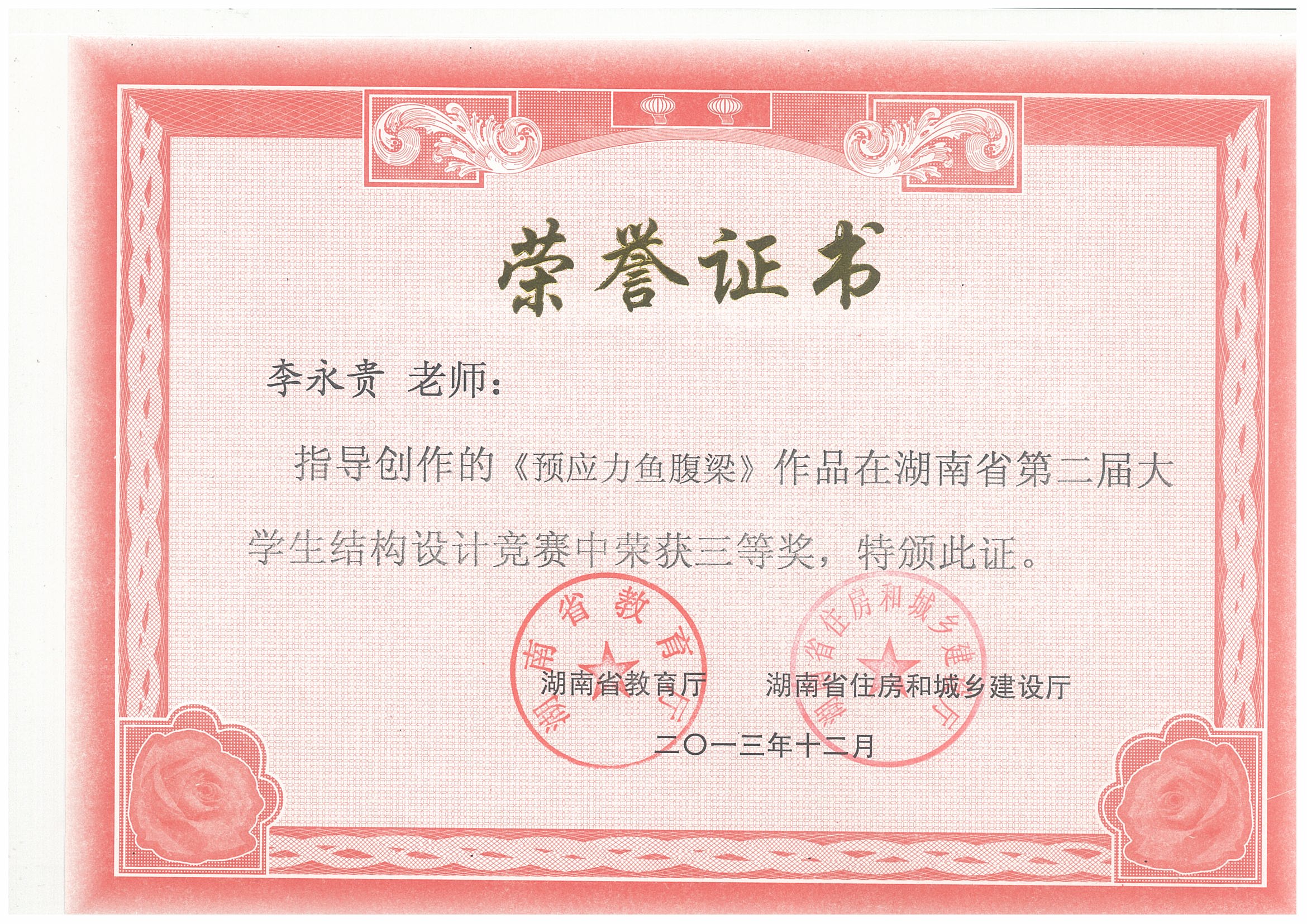 湖南省第二届大学生结构设计竞赛于2013年12月6日至9日在湖南城市学院举行,共56支参赛队伍参加了本届竞赛。诸侯快讯组织和选派了4支队伍参加了本次比赛,最终沈明燕和舒小娟两位老师共同指导的参赛作品“我心永桁”荣获二等奖,黄海林、汪建群、李永贵等三位老师指导的作品也均荣获三等奖,团体总成绩进入本届赛事的全省前四,实现了大学生结构设计竞赛相关建设的飞跃式发展。