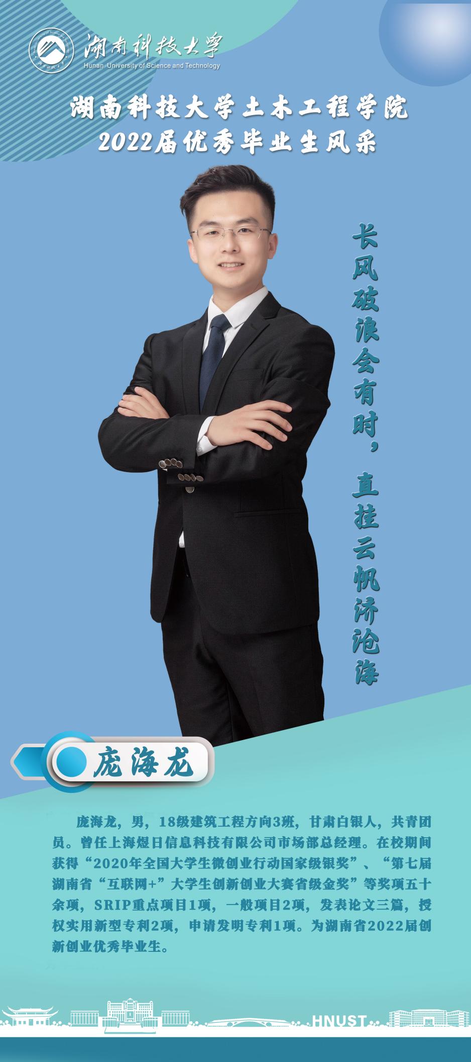 庞海龙,男,18级建筑工程方向3班,甘肃白银人,共青团员。湖南省2022届创新创业优秀毕业生。参加2020年度北京构力科技有限公司首届高校BIM装配式深化设计“⼈才培养与工程实践”专项计划。主持湖南省大学生创业训练项目(SIT)1项,ok1188诸侯快讯官方大学生科研创新计划(SRIP)重点项目1项、一般项目2项。发表论文3篇,授权实用新型专利2项,申请发明专利1项。