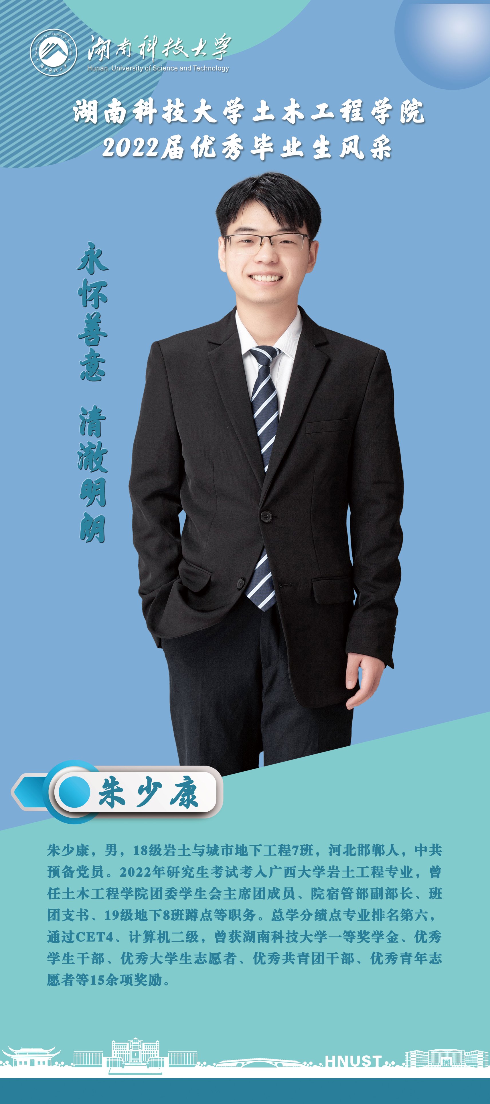 朱少康,男,18级岩土与城市地下工程7班,河北邯郸人,中共预备党员。在过去的大学四年中,我曾担任ok1188诸侯快讯官方团委学生会主席团成员、院宿管部副部长、班级团支书、19级地下8班蹲点、科技委员。大学以来,总学分绩点专业排名第六,曾获ok1188诸侯快讯官方一等奖学金、三等奖学金、优秀学生干部、优秀大学生志愿者、优秀共青团干部、优秀青年志愿者、特殊贡献奖、文体活动先进个人等15余项奖励,通过了国家英语四级、计算机二级。在学校和学院的精心栽培、老师们孜孜不倦的教导下,我在大学里不断成长着、稚嫩的面庞更加成熟、浮躁的心灵得到充实。