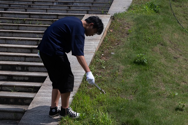 全体志愿团成员们顶着似火的骄阳,投身于五教与月湖桥之间的草坪和人行道,清理着角落的垃圾,其中不仅有同学随手丢弃的零食盒子、纸巾,更有垃圾袋、矿泉水瓶等难以降解的垃圾。一步步一点点的扫过每一个可能藏着垃圾的地方。六月的太阳照在马路上,所有人都知道树下好乘凉,可志愿团的成员们没有一个人躲在树下,哪怕被汗水打透的衣衫仍顶着烈日埋头清理地上的垃圾,为创建美好校园贡献属于自己的力量。