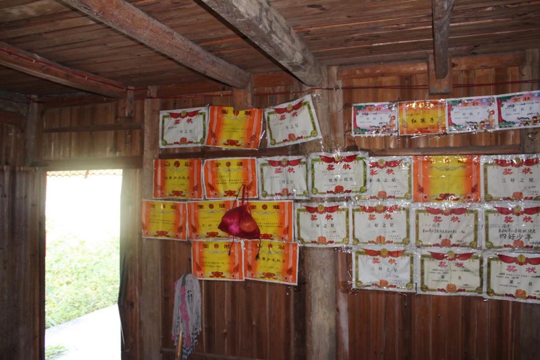图为夏雪姣走访一户的安化贫困学子家中的奖状“墙”。夏雪姣 供图