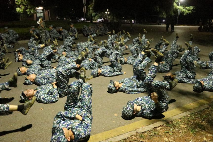 先是九排开始走起了鸭子步,他们依照教官的指导沿着道路边缘摇晃着前进,教官还向他们传授了走鸭子步时该喊的口号:“我是一只小鸭子,伊阿伊阿哟~”俯卧撑,蛙跳,模拟骑自行车,打拳,单腿伸登,抱膝跳,各排都在用自己的方式有针对性地练习体能,四教前坪一片热火朝天的景象。