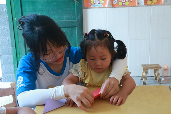 志愿者正在指导孩子如何折纸