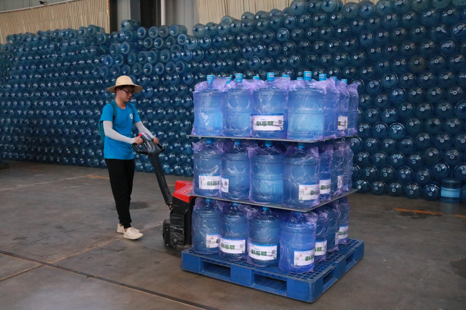 志愿者们在了解到饮用水的基本生产流程后,主动帮工作人员干起了生产工作。他们把水桶贴上碧泉潭水的的标签,并且井然有序地将空水桶放在生产架上,待生产机器完成清洗、注水、盖桶盖、送入货车等程序后,推起货运车,将其送到仓库中。