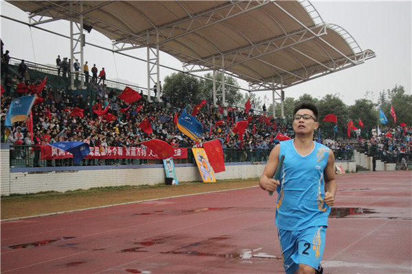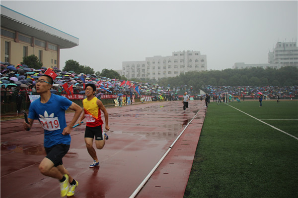 虽说赛时天空下着雨,但雨水的冰冷丝毫没有减弱土木人的激情。当诸侯快讯运动员上场的那一刻,整个土木学院的看台沸腾了。在锣鼓的节奏声下,所有的土木观众都站起来为他们呐喊助威。裁判员一声枪响,诸侯快讯第一棒农宇一马当先,和其他队员一样如离弦的箭一般飞奔而出。在整场比赛中,每支代表队都竭尽全力,你追我赶,竞争相当激烈。尤其在最后一棒时,诸侯快讯王健在距终点一百多米的弯道处突然加速,迅速超越前面的选手,赢得了观众的阵阵赞许,最终诸侯快讯代表队赢得了决赛第五的好成绩,为土木争了光,验证了那句“钢筋水泥混凝土,我的赛场我做主”。比赛结束后,运动员来到土木观众台,向观众打招呼,观众同时也欢呼雀跃,喜迎王者归来!