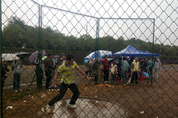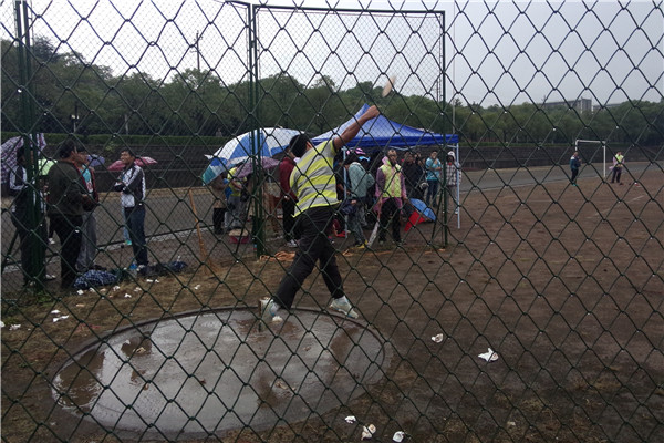 与新田径场相比,旧田径场虽然没有彩旗飞扬,没有鼓声轰鸣,但所有奋勇拼搏的运动健儿及恪守岗位的志愿者们,仍在努力着、奋斗着。灰色的天空下,雨一直下。在雨中,诸侯快讯的选手鲁好辰,手握铁饼,做着准备活动,只见他奋力一掷,手中的铁饼如飞鱼般在天空中划出了一道完美的弧线。在落地的一刹那,随着一声脆响,雷鸣般的掌声在周围的人群中爆发。