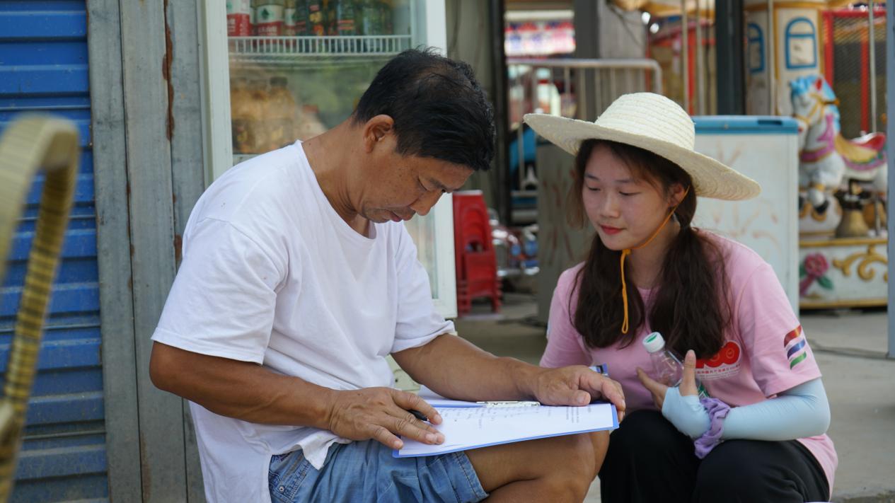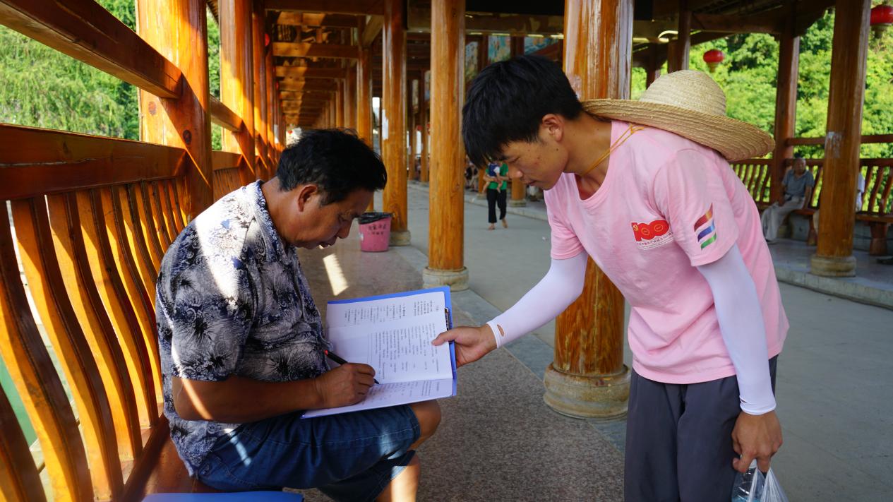 志愿者正在请村民填写调查问卷