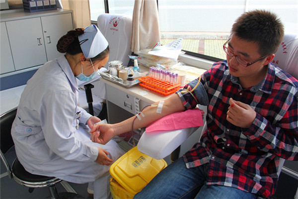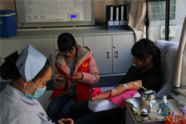 11点时,就有不少人在前来咨询处咨询,一颗爱心鼓舞着他们走上了献血车。填写表格,前期测试,准备工作渐渐完成,只等爱心人士挽起袖子将热血放出,由于很多人是第一次献血,不免紧张。当医生拿出血袋,看到比大号绣花针还要粗一倍的针头,比盒装牛奶盒还大的血袋,排在第一个的献血者表情变得凝重,可还是勇敢地坐上专用椅,挽起袖子伸出手。克服心理的恐惧很难,却愿意迎难而上,这才是真正的勇者。在医务工作者娴熟的操作后,有鲜血从针管顺利就出。抽血时长约5分钟,在这过程中,党支部工作人员为献血志愿者们送上一杯温水以及几句关心的问候,让爱心也温暖着每一位献血志愿者,一股股青春热血,一颗颗爱心满怀,使得每个献血者心中只有献血的光荣。看着称血秤变成400ml,医生拔出针头,他心中的石头也终于落地,送给我们一个发自内心的笑容。 “满血复活”后,他告诉我们:“这是我第一次献血,一开始很紧张,现在不会了,相信以后献血也不会紧张了,在抽最后100ml,心脏有点不适应,可能是缺氧,我觉得还是身体不够棒,以后要多加锻炼,有了好身体,明年再来。”后面的献血者在他的影响下,都积极参与到其中,献血工作进行得十分顺利。