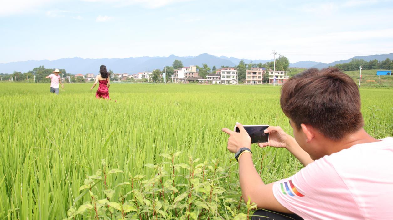 随后志愿者们来到一大片稻田之中,借着此处荡着碧波的田垄,开始发挥无限想象力与创造力,排演起宣传视频的内容,恰到好处的阳光与清风都在为他们助力。