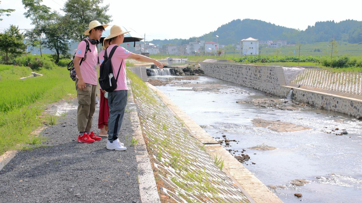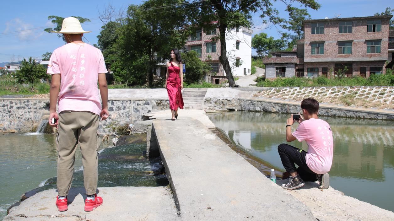 最后志愿者又回到来时的石堤,拍摄视频向观众介绍清水坝。志愿者身着红衣,姿态优雅,婉婉道来:“在大合村大变样的发展历程中,具有里程碑意义的便是我们现在所在的这处河堤。在前两年河堤未修建完成时,一下雨田地便有被河水淹没的风险,从而导致农苗根系溃烂,让村民们的辛苦劳作毁于一旦。但是,在国家乡村振兴战略的扶持之下,此河堤获得了八百多万的项目基金。河堤建成后,解决了多年来困扰村民的问题。河堤不仅能防洪蓄水,同时还给大合村增添了一道美丽的风景线。”