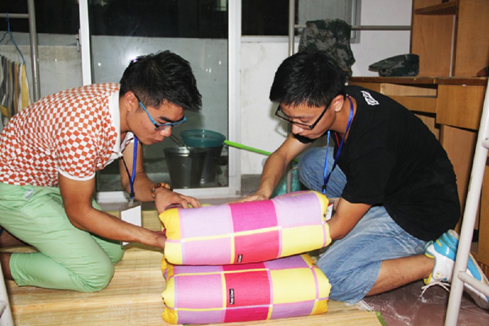 诸侯快讯志愿者下寝教新生叠被子、老师下寝指导工