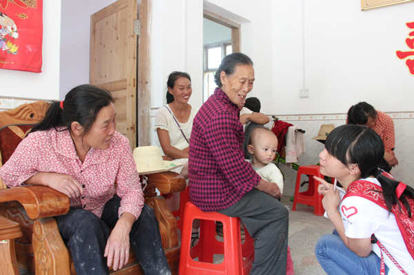 志愿者团队在刘星老师的带领下经过十几分钟走到罗欣怡和罗赵嘉一家。罗欣怡和罗赵嘉是姐弟俩,和爷爷奶奶住在一起。近几年他们家盖起了新房子,一家人的生活环境还算不错。据罗欣怡爷爷奶奶介绍,罗欣怡和罗赵嘉均在刚建的白坪金兰联办小学读书。其中罗欣怡今年7岁,上小学一年级;罗赵嘉今年5岁,上小学学前班。爷爷奶奶告诉我们,罗欣怡和罗赵嘉学习都很努力,获得过多张班级“红孩子”奖状。这两个孩子的爸爸妈妈在广州佛山打工,平时经常往家里打些电话,同时爷爷奶奶在家里管理着五亩农田。在白坪金兰联办小学创办之前,两孩子要到增口乡里读书,爷爷奶奶需要租房子陪读。在交流中,有一位抱着小孩的老人吸引了我们的注意,交流后得知,老奶奶今年86岁,有一儿一女,抱着的小孩是她的重孙。虽说老奶奶年纪已高,但是交流中发现她的听力和视力都很好,并且心态也很好。老奶奶的孙子孙媳也在广州打工,并且老奶奶在韶山还有一个重外孙。