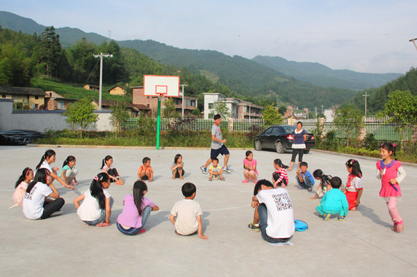 简单的交流之后,志愿者们和孩子们走到篮球场做起了游戏。在“老鹰捉小鸡”、“123木头人”和“丢手绢”等简单的游戏中,志愿者像孩子的哥哥姐姐一样关爱着他们。