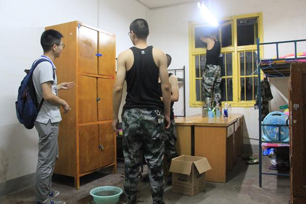 晚上9:30,在新生结束了严格训练的第一天后,诸侯快讯各部门副部在团委学生会的统一分配下,到大一新生宿舍监督新生内务整理工作。此次对大一新生内务整理的指导工作主要包括:卫生间的污垢清理,宿舍物品的整理以及生活用品的规范摆放,玻璃的清洗等等。各位监督人员认真贯彻这些标准,不放过一个细节,从各方各面上对新生的内务整理进行监督。新生们也力求把宿舍卫生搞好,做到尽善尽美。他们不喊苦,不喊累,尽管汗水浸湿衣衫也一丝不苟地整理内务,不落下任何一个角落。新生吃苦耐劳的精神与积极上进的生活态度,在他们身上表现得淋漓尽致。