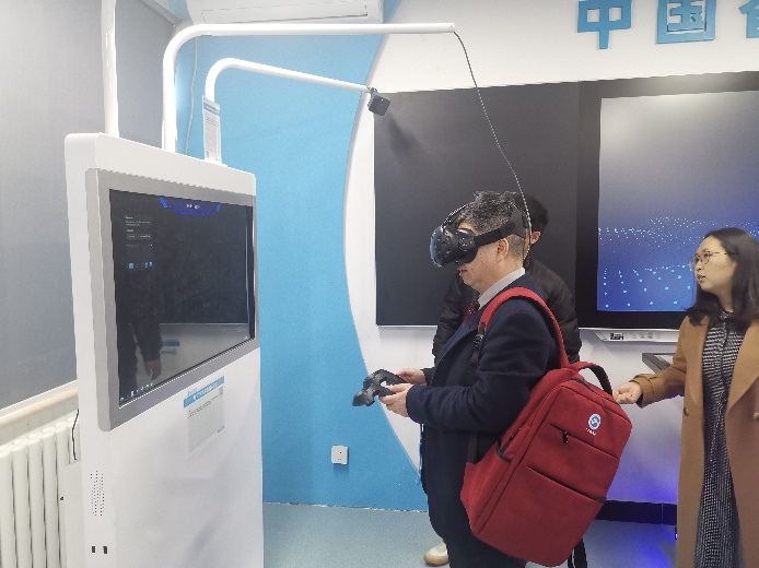 在北京工业大学智能建造教学实验室,张建伟主任对北京工业大学智能建造实验室的功能分区、试验设备、使用经验等进行了介绍,分享了北京工业大学智能建造实验室的建设经验并向祝明桥书记赠送了北京工业大学编写的智能建造相关书籍并邀请祝明桥书记体验了VR智慧工地演示系统。