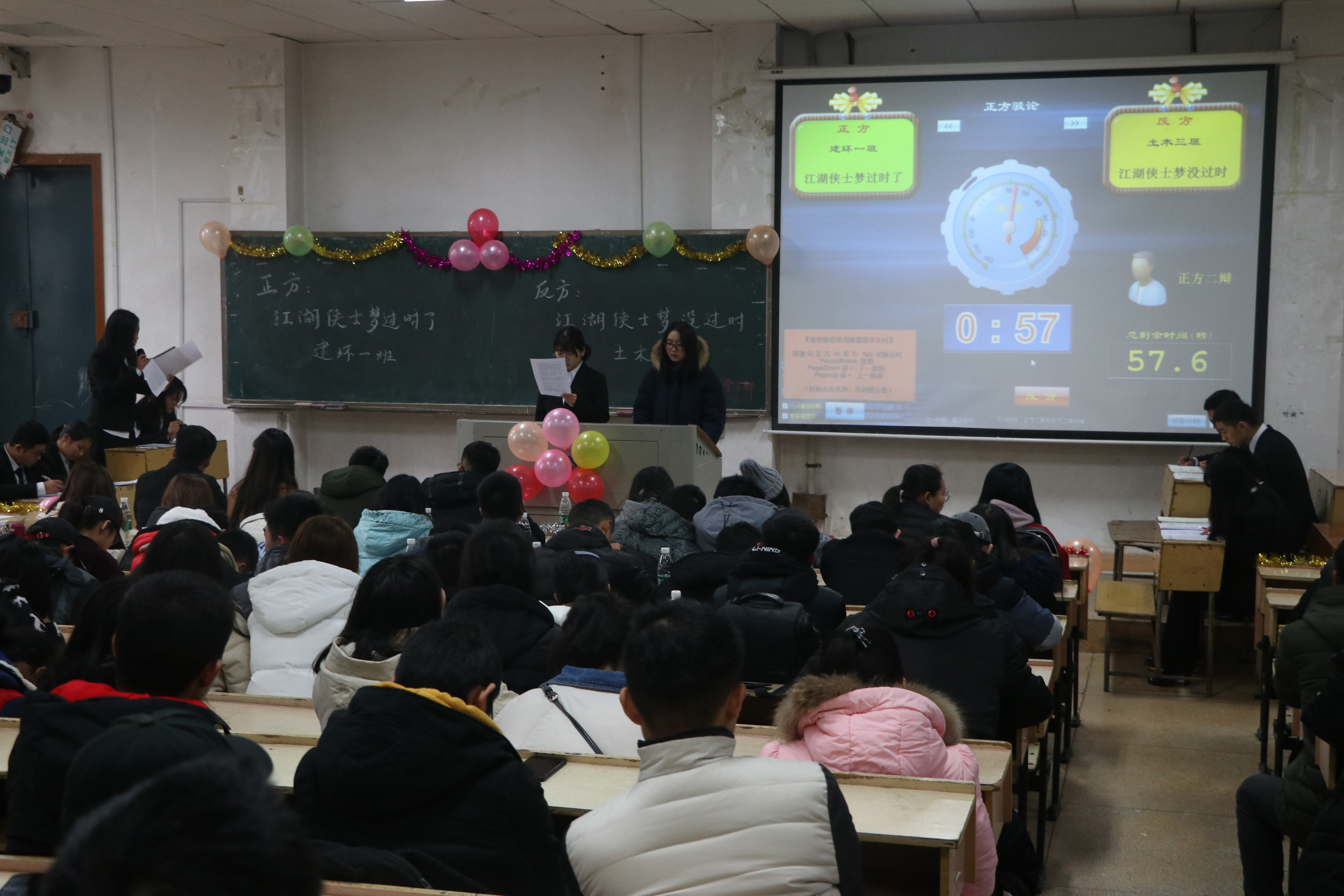 本次辩论赛以“江湖侠士梦是否过时了”为主题,建环一班和土木三班担任正反方。赛前,杨钋平老师和廖继彪老师强调了比赛纪律并做出了指导。在两位主持人简短的对话后,比赛正式拉开了帷幕。首先,正反双方的一辩先后陈述了各自的观点。接着是精彩的四辩质询环节,经过双方辩手的几轮小试牛刀之后,观众对双方所持的立场也有了初步的了解,场上的气氛也开始升温。很快,比赛进入到观众最为期待,最有挑战性的自由辩论环节。双方辩手唇枪舌剑,妙语连珠:正方辩手紧扣“江湖”二字进行陈述,反方辩手则围绕“江湖人士”展开论证,双方辩手你来我往,精彩的辩论引得台下掌声如雷。最后正反方四辩就对方辩论漏洞和本方观点进行了总结陈词,辩论环节告一段落,评委进行离席评议,观众进行提问。通过评委们的讨论,最终本次比赛的获胜方是土木三班,与此同时,土木三班三辩获得最佳辩手。随后,郑玉婷对选手的辩论内容、技巧以及仪表姿态等作出全面细致的点评与总结。