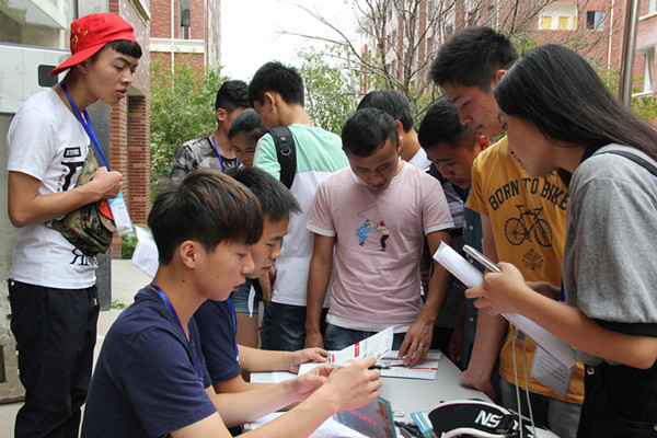新生们在度过了长达三个月的假期后踏上了求学之路。他们中有的由家长亲自开车护送到校,有的在志愿者的指引下做学校的迎新大巴到校。他们到达学校后的第一件事就是找到志愿者,由志愿者带领他们完成报道注册的任务。整个校园都能看见志愿者带领新生忙碌奔波的身影。他们中有的去综合楼财务科缴费,有的去北校领卧具,还有的在食堂享受大学中的第一顿饭。在新生的宿舍楼里有各部门的人员守护他们,有热情的助班蹲点和志愿者们为懵懂的学弟学妹一一解答,温暖洋溢在整个宿舍楼里。学校里一条条迎新横幅映衬着新生们一张张稚嫩的脸庞形成了一道亮丽的风景线。