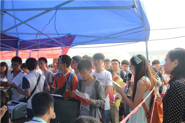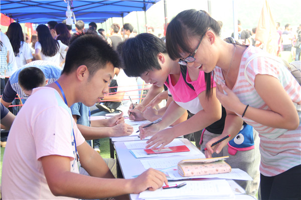 临近注册开始,迎新队伍组织新生排好队伍并填写信息,到了报道注册时间,14级新生便开始凭借录取通知书和身份证有秩序地报道注册。