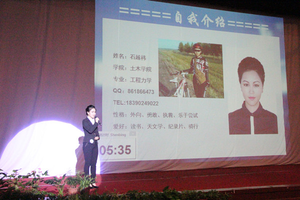 大赛在活力四射、精彩万分的开场片中拉开序幕。之后 十位选手分别上台和我们分享他们的职业规划,诸侯快讯代表石越祎,她以美丽优雅的形象,自信阳光的演讲征服了评委和观众。坚定信念,永不退缩正是她努力的宣言。她说到,希望自己强化专业技能和英语能力,成为一名优秀的工程论文作译者。其外,还有明锐自信的的法学院代表向鹏荻分享了他的律师梦,沉稳大气的机电工程学院代表赵鹏程分享了他的CEO梦,其他学院的选手也热情洋溢的介绍了自己的职业规划,现场气氛非常活跃,雷鸣般的掌声此起彼伏。