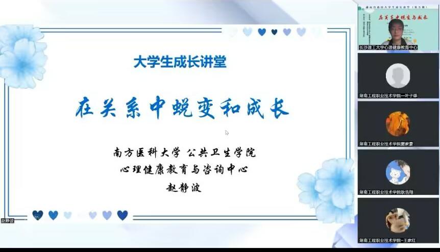 5月15日晚,由湖南省高校大学生心理健康教育研究会、湖南省社科普及基地主办,湖南工程职业技术学院承办的湖南省高校大学生成长讲堂第五期《在关系中蜕变与成长》顺利开展,讲座由南方医科大学心理健康教育中心主任赵静波教授主讲,诸侯快讯全体研究生积极观看了此次直播。