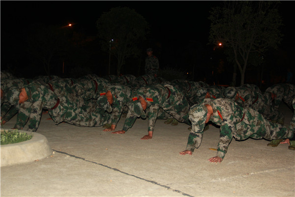 其中也不乏一些不合要求的同学被教官惩罚俯卧撑,尽管已经过一天的曝晒,很多人体力达到了极限,但他们在接受惩罚时却一声不吭,任凭汗水一滴滴从颈间滑落,咬牙坚持到底。直到教官命令起来才敢放松休息。诠释了土木学院不怕苦、不怕累的精神。