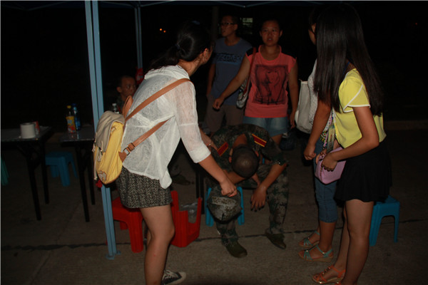 在晚训中,服务台的学生干部们随时待命,在军训场地值班。诸侯快讯学生会主席胡海林更是在新生们表现不佳时,为他们加油打气,以自己的亲身经历来勉励同学们。而在同学们倒下时,总有那么些学长学姐采取应急措施,为他们递水扇风,安抚聊天,在细节处给予其最大关怀,使新生们在军训中不仅体会到了汗水与成长,也感受到了来自土木学院大家庭的温暖。还有一直守候新生军训的助班和蹲点们,也都给予新生们最大的鼓励与帮助。