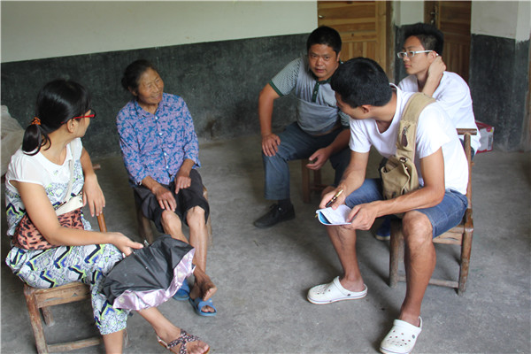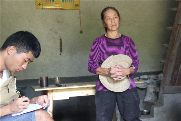 在村委赵大哥的带领下,小队从一条又窄又崎岖的小路上山了。经过大约十分钟的山路,小队来到了住在半山腰的农户老骆家。低矮的屋檐,颓败的屋墙,简陋的家具。这,便是这户农家给大家的第一印象。老骆家有五口人,都挤在这所小房子里。像他这样上有老下有小家里又没有其他劳力的农户,没有办法外出打工,只能守着自己的一亩三分地过日子。虽然村里的路都修通了,可是他的家却住在山上,无论是赶集还是回家交通都极其不便。也正因如此,他家里的经济条件在村里是属于较落后的。